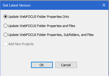 You can also use this option to get an entire new project from Source Control to WebFOCUS (the folder does not exist in WebFOCUS). To do this, create an empty folder in WebFOCUS that exactly matches the name and case of the folder name in Source Control. On the Get Latest Version dialog box, select the Update WebFOCUS Folder Properties, Subfolder, and Files and Add New Projects options.