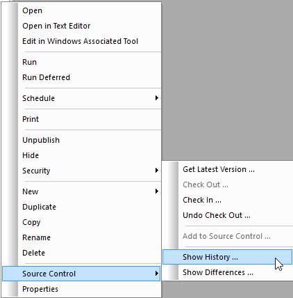 Note: If files and folders are not published, Source Control options are not available. The same applies if you are not connected to Source Control.