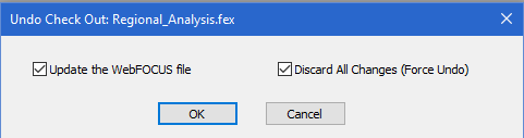 You can control the replacement of the local WebFOCUS file copy by selecting Do not update the file in the WebFOCUS repository. When this option is selected, the file is only marked as checked out and it does not update the file currently in the WebFOCUS repository with the version of the file that is in the Source Control database. This allows you to preserve changes that are made to the WebFOCUS version of the file. A later check in operation will update the Source Control file with the one from WebFOCUS.