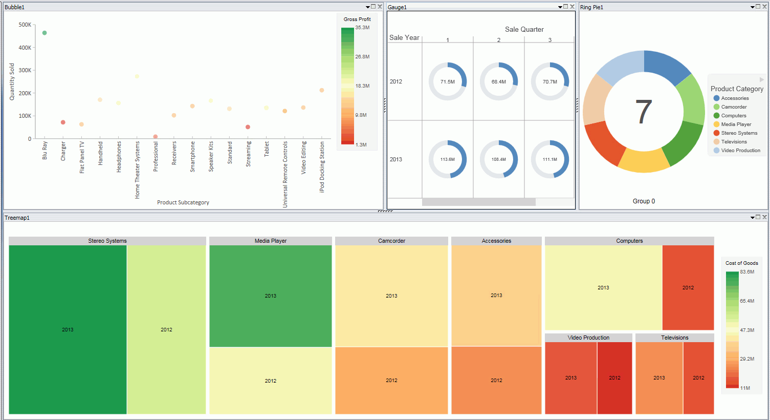 The following image shows a visualization that contains multiple visuals, including a bubble, gauge, ring pie, and treemap.