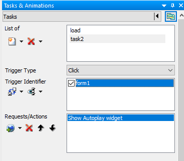 You can enable the autoplay setting for the widget in the Tasks & Animations panel. The widget selected may require the following configurations: