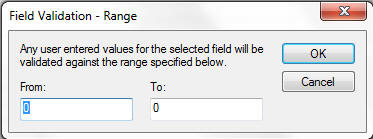 When you choose the Range option to validate a field, Update Assist opens the Field Validation - Range dialog box. You use this option with numeric fields to specify a range of values for any information the user enters. The Field Validation - Range dialog box is shown in the following image.