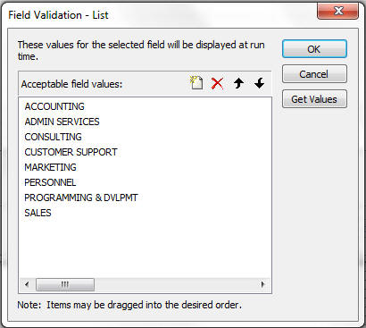Static List. Allows you to supply a list of valid values from which the user selects at run time. When Static List is selected, the Field Validation - List dialog box opens. To retrieve a list of all values currently in the database, click the Get Values button. You can edit this supplied list. For details, see How to Use a Static List to Validate a Field.