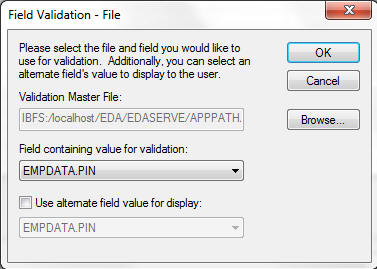 Dynamic List. Allows you to supply a list of valid values for the field that are retrieved from a specified data source at run time. When Dynamic List is selected, you are prompted for the Master File and field from which to retrieve values. For details, see How to Use a Dynamic List to Validate a Field.
