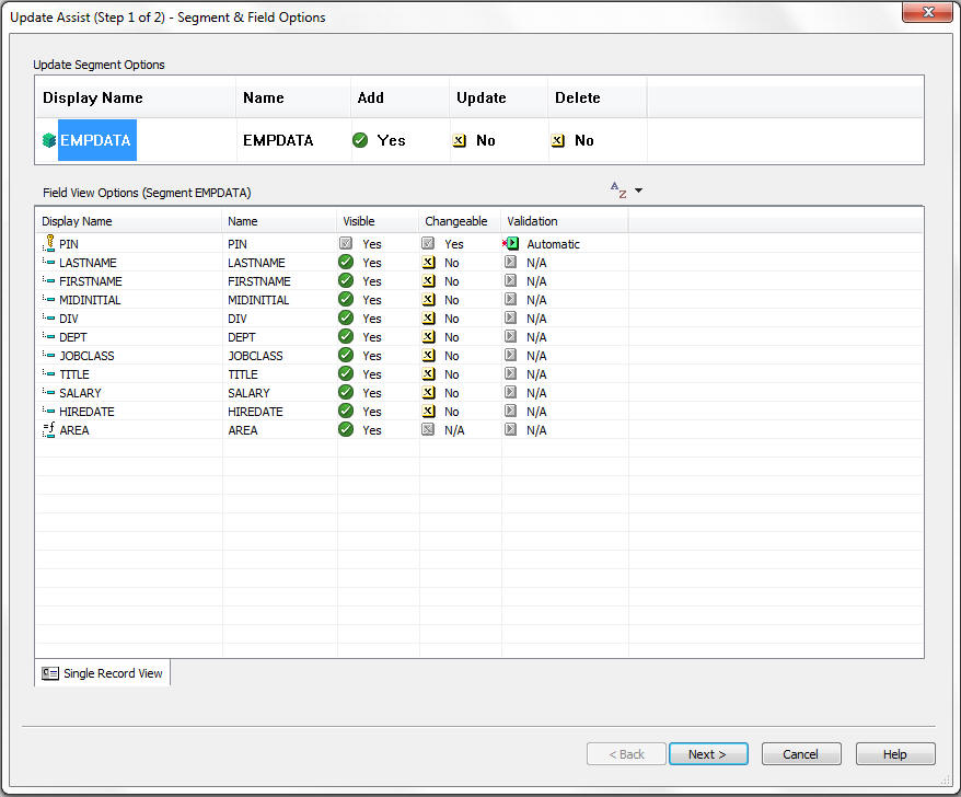 In the Segment & Field Options window of Update Assist, you select the segment and fields you want to update.