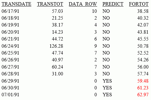 In the following example, the DATA_ROW virtual field has the value 1 for each row in the data source. It has the value zero for the predicted rows. The PREDICT field is calculated as YES for predicted rows, and NO for rows containing data. In addition, the StyleSheet attribute WHEN=FORECAST is used to display the predicted values for the FORTOT field in red.