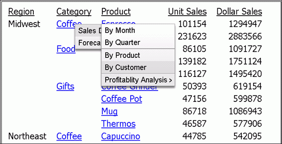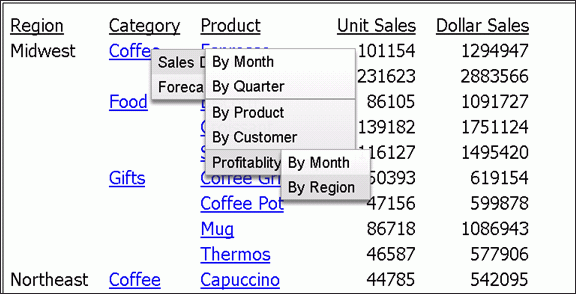 Note: As of Release 8.2 Version 01, when the Multi-Drill and On Demand Paging features are enabled in a report, the cascading Multi-Drill menus do not display. Instead, the legacy Multi-Drill menus generated prior to Release 8.2.01 will be generated. Cascading menus are not available and all hyperlinks display on the same level on the menu.