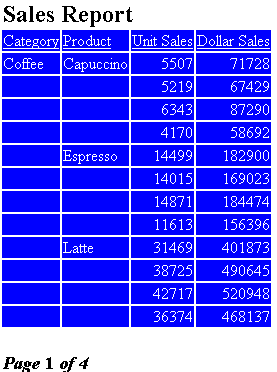 TABLE FILE GGSALES SUM UNITS DOLLARS BY CATEGORY BY PRODUCT HEADING "Sales Report:" "First Quarter" ON TABLE SET PAGE-NUM OFF ON TABLE SET STYLE * TYPE=REPORT, GRID=OFF, $ TYPE=HEADING, STYLE=BOLD, SIZE=12, $ TYPE=HEADING, LINE=2, STYLE=ITALIC, $ ENDSTYLE END