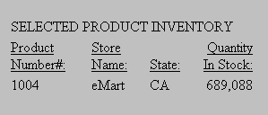 SET HTMLCSS = ON TABLE FILE CENTORD ON TABLE SUBHEAD "SELECTED PRODUCT INVENTORY" SUM QTY_IN_STOCK/D12 BY PROD_NUM BY SNAME BY STATE WHERE PROD_NUM EQ '1004' WHERE SNAME EQ 'eMart' WHERE STATE EQ 'CA' ON TABLE SET PAGE-NUM OFF ON TABLE SET STYLE * TYPE=REPORT, PAGECOLOR=SILVER, GRID=OFF, $ ENDSTYLE END