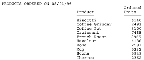SET ONLINE-FMT = PDF TABLE FILE GGORDER "PRODUCTS ORDERED ON 08/01/96" SUM QUANTITY BY PRODUCT_DESCRIPTION WHERE ORDER_DATE EQ '080196' ON TABLE SET PAGE-NUM OFF ON TABLE SET STYLE * TYPE=REPORT, COLUMN=PRODUCT_DESCRIPTION, POSITION=3, $ TYPE=REPORT, COLUMN=QUANTITY, POSITION=+2, $ ENDSTYLE END
