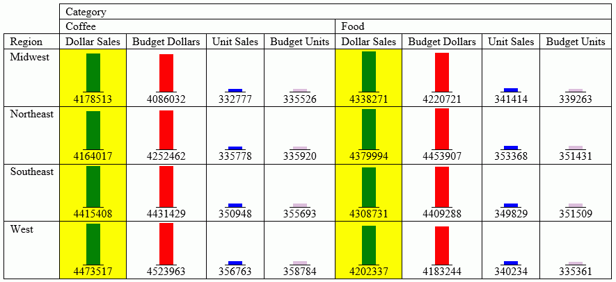 SET VISBARORIENT=V TABLE FILE GGSALES SUM DOLLARS BUDDOLLARS UNITS BUDUNITS BY REGION ACROSS CATEGORY WHERE CATEGORY EQ 'Coffee' OR 'Food' ON TABLE SET PAGE NOLEAD ON TABLE SET STYLE * TYPE =REPORT , BORDER=light,$ GRAPHTYPE=DATA, ACROSSCOLUMN=DOLLARS, GRAPHCOLOR=GREEN,BACKCOLOR=RGB(#ffff00), $ GRAPHTYPE=DATA, ACROSSCOLUMN=BUDDOLLARS, GRAPHCOLOR=RGB(255 0 0), $ GRAPHTYPE=DATA, ACROSSCOLUMN=UNITS, GRAPHCOLOR=blue, $ GRAPHTYPE=DATA, ACROSSCOLUMN=BUDUNITS, GRAPHCOLOR=thistle, $ ENDSTYLE END
