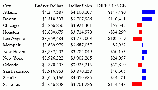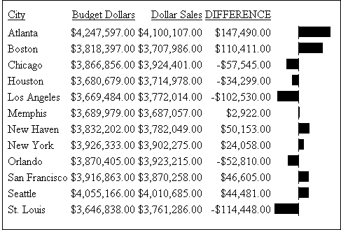 The following illustrates how to generate a bar graph for data in your report. Since this report is sorted with the BY field CITY, horizontal bar graphs display in the output. You can change this to vertical bars be changing the sort field to ACROSS CITY and the StyleSheet declaration to GRAPHTYPE=DATA, ACROSSCOLUMN=DIFFERENCE, $. Bar graphs that represent positive values display in the color blue. Bar graphs that represent negative values display in the color red.