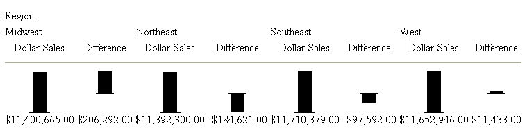 Since the GRAPHSCALE attribute is not specified, the default setting UNIFORM is applied to the report. This setting uses the entire set of values (values from Dollar Sales and Difference) to plot the bar graphs for both columns.