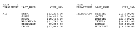 This request divides the first report page in two columns so that the second report page appears in the second column of the first page. A PAGE-BREAK creates a multi-page report for the purpose of this example.