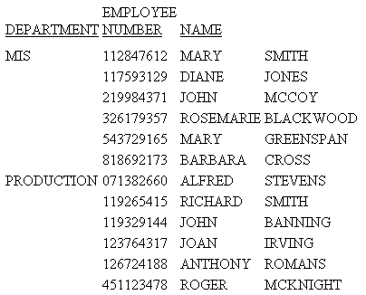 TABLE FILE EMPLOYEE PRINT FIRST_NAME AS 'NAME' AND LAST_NAME AS '' BY DEPARTMENT BY EMP_ID AS 'EMPLOYEE,NUMBER' ON TABLE SET PAGE-NUM OFF ON TABLE SET ONLINE-FMT HTML ON TABLE SET STYLESHEET * TYPE=REPORT, GRID=OFF, $ ENDSTYLE END