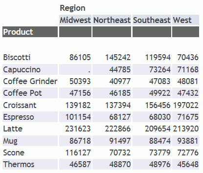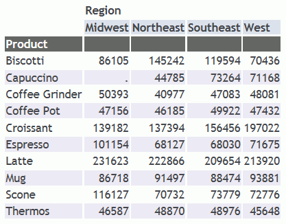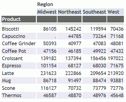 SET TITLELINE=ON TABLE FILE GGSALES SUM UNITS BY PRODUCT ACROSS REGION ON TABLE SET PAGE-NUM OFF ON TABLE SET STYLE * INCLUDE=IBFS:/FILE/IBI_HTML_DIR/javaassist/intl/EN/ENIADefault_combine.sty,$ ENDSTYLE END