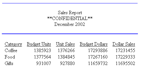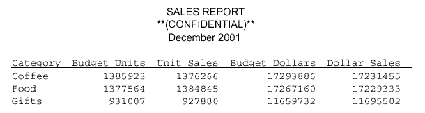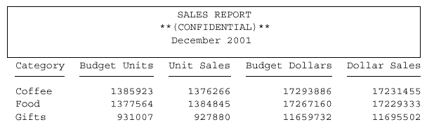 TABLE FILE GGSALES SUM BUDUNITS UNITS BUDDOLLARS DOLLARS BY CATEGORY ON TABLE SUBHEAD "SALES REPORT" "**(CONFIDENTIAL)**" "December 2001 </1" ON TABLE SET PAGE-NUM OFF ON TABLE SET ONLINE-FMT PDF ON TABLE SET SQUEEZE ON ON TABLE SET STYLESHEET * TYPE = TABHEADING, JUSTIFY = CENTER, GRID=ON, $ ENDSTYLE END