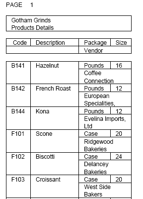TABLE FILE GGPRODS PRINT PACKAGE_TYPE AS '' SIZE AS '' OVER VENDOR_NAME AS '' BY PRODUCT_ID AS '' BY PRODUCT_DESCRIPTION AS '' ON TABLE SUBHEAD "Gotham Grinds" "Products Details" HEADING " Code <+0>Description<+0>Size <+0>Package" -*" <+0> <+0>Vendor" " <+0>Vendor" ON TABLE PCHOLD FORMAT PDF ON TABLE SET STYLE * TYPE=REPORT, FONT=ARIAL, SIZE=10, SQUEEZE=ON,$ TYPE=REPORT, COLUMN=PACKAGE_TYPE, SQUEEZE=.5 ,$ TYPE=REPORT, COLUMN=VENDOR_NAME, WRAP=1 ,$ TYPE=REPORT, BORDER=ON, $ TYPE=HEADING, LINE=1, ITEM=1, BORDER=ON, $ TYPE=HEADING, LINE=1, ITEM=2, BORDER=ON, POSITION=PRODUCT_DESCRIPTION,$ TYPE=HEADING, LINE=1, ITEM=3, BORDER=ON, POSITION=SIZE ,$ TYPE=HEADING, LINE=1, ITEM=4, BORDER=ON, POSITION=PACKAGE_TYPE, $ TYPE=HEADING, LINE=2, ITEM=1, BORDER=ON, $ TYPE=HEADING, LINE=2, ITEM=2, BORDER=ON, POSITION=PACKAGE_TYPE,$ ENDSTYLE END