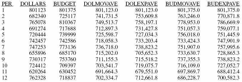 DEFINE FILE GGSALES SDATE/YYM = DATE; SYEAR/Y = SDATE; SMONTH/M = SDATE; PERIOD/I2 = SMONTH; END TABLE FILE GGSALES SUM DOLLARS AS 'DOLLARS' BUDDOLLARS AS 'BUDGET' BY CATEGORY NOPRINT BY PERIOD AS 'PER' WHERE SYEAR EQ 97 AND CATEGORY EQ 'Coffee' ON PERIOD RECAP DOLMOVAVE/D10.1= FORECAST(DOLLARS,1,0,'MOVAVE',3); ON PERIOD RECAP DOLEXPAVE/D10.1= FORECAST(DOLLARS,1,0,'EXPAVE',4); ON PERIOD RECAP BUDMOVAVE/D10.1 = FORECAST(BUDDOLLARS,1,0,'MOVAVE',3); ON PERIOD RECAP BUDEXPAVE/D10.1 = FORECAST(BUDDOLLARS,1,0,'EXPAVE',4); END