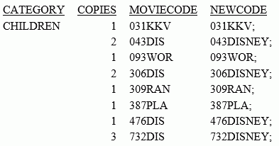 TABLE FILE MOVIES PRINT COPIES MOVIECODE COMPUTE NEWCODE/A20 = MOVIECODE |(IF MOVIECODE CONTAINS 'DIS' THEN 'NEY;' ELSE ';'); BY CATEGORY WHERE CATEGORY EQ 'CHILDREN' ON TABLE SET PAGE NOLEAD ON TABLE SET STYLE * GRID=OFF,$ ENDSTYLE END