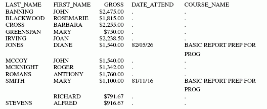 LAST_NAME FIRST_NAME GROSS DATE_ATTEND COURSE_NAME --------- ---------- ----- ----------- ----------- JONES DIANE $1,540.00 82/05/26 BASIC REPORT PREP FOR PROG SMITH MARY $1,100.00 81/11/16 BASIC REPORT PREP FOR PROG