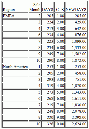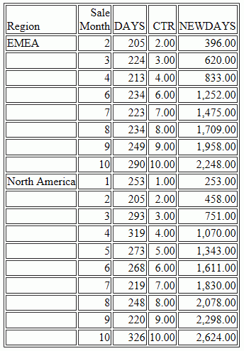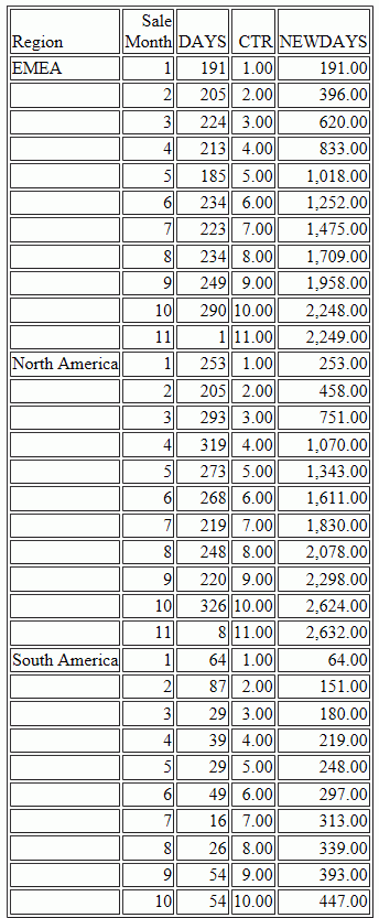 ENDThe output is shown in the following image. The COMPUTE calculation for NEWDAYS was processed after eliminating the rows in which TOTAL DAYSDELAYED were 200 or less, so its values are based on fewer rows than the calculations in the original request. This is verified by the CTR values, which are now in a continuous sequence. The rolling total now reflects the values that are actually displayed on the report output.