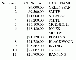 RANK CURR_SAL LAST_NAME ---- -------- --------- 1 $29,700.00 BANNING 2 $27,062.00 CROSS 3 $26,862.00 IRVING 4 $21,780.00 BLACKWOOD 5 $21,120.00 ROMANS