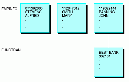 The data source was designed with storage efficiency in mind, and so the bank fields have been put into a separate segment called FUNDTRAN. Space is only used for the banking information, creating an instance of FUNDTRAN, if it is needed. However, if banking fields are used in the parent segment (EMPINFO), the EMPINFO segment for each employee reserves space for the banking fields, even though those fields are empty in most cases. This concept is illustrated in the following diagram.