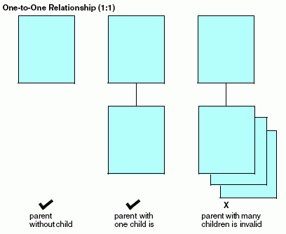 The child in a one-to-one relationship is referred to as a unique segment, because there can never be more than a single child instance. The following diagram illustrates the concept of a one-to-one relationship.