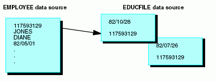 You use a one-to-many join (that is, a non-unique join) when you may have several instances of data in the cross-referenced segment associated with a single instance in the host segment. Using our EMPLOYEE example, suppose that you kept an educational data source named EDUCFILE to track course work for employees. One segment in that data source, ATTNDSEG, contains the dates on which each employee attended a given class. The segment is keyed by attendance date. The EMP_ID field, which identifies the attendees, contains the same ID numbers as the EMP_ID field in the EMPINFO segment of the EMPLOYEE data source.
