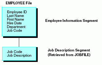 Although the Employee Information and Job Description segments are stored in separate data sources, for reporting purposes the EMPLOYEE data source is treated as though it also contains the Job Description segment from the JOBFILE data source. The actual structure of the JOBFILE data source is not affected.