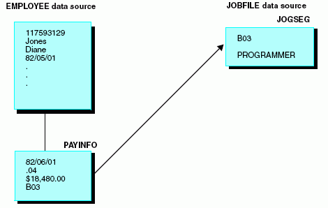FILENAME = EMPLOYEE, SUFFIX = FOC, $ SEGNAME = EMPINFO, SEGTYPE = S1, $ . . . SEGNAME = PAYINFO, SEGTYPE = SH1, PARENT = EMPINFO, $ FIELDNAME = JOBCODE, ALIAS = JBC, FORMAT = A3, $ . . . SEGNAME = JOBSEG, SEGTYPE = KU, PARENT = PAYINFO, CRFILE = JOBFILE, CRKEY = JOBCODE, $
