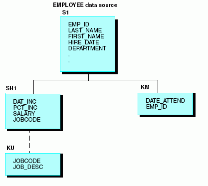 FILENAME = EMPLOYEE, SUFFIX = FOC, $ SEGNAME = EMPINFO, SEGTYPE = S1, $ FIELDNAME = EMP_ID, ALIAS = EID, FORMAT = A9, $ . . . SEGNAME = PAYINFO, SEGTYPE = SH1, PARENT = EMPINFO, $ FIELDNAME = JOBCODE, ALIAS = JBC, FORMAT = A3, $ . . . SEGNAME = JOBSEG, SEGTYPE = KU, PARENT = PAYINFO, CRFILE = JOBFILE, CRKEY = JOBCODE, $ . . . SEGNAME = ATTNDSEG, SEGTYPE = KM, PARENT = EMPINFO, CRFILE = EDUCFILE, CRKEY = EMP_ID, $