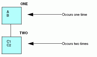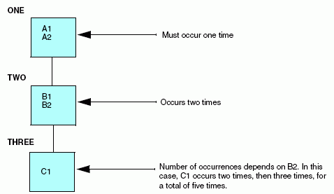 In this example, field C1 only occurs after fields B1 and B2 occur once. It occurs varying numbers of times, recorded by a counter field, B2. There is not a set of occurrences of C1 which is not preceded by an occurrence of fields B1 and B2. Fields B1, B2, and C1 are a nested set of repeating fields.