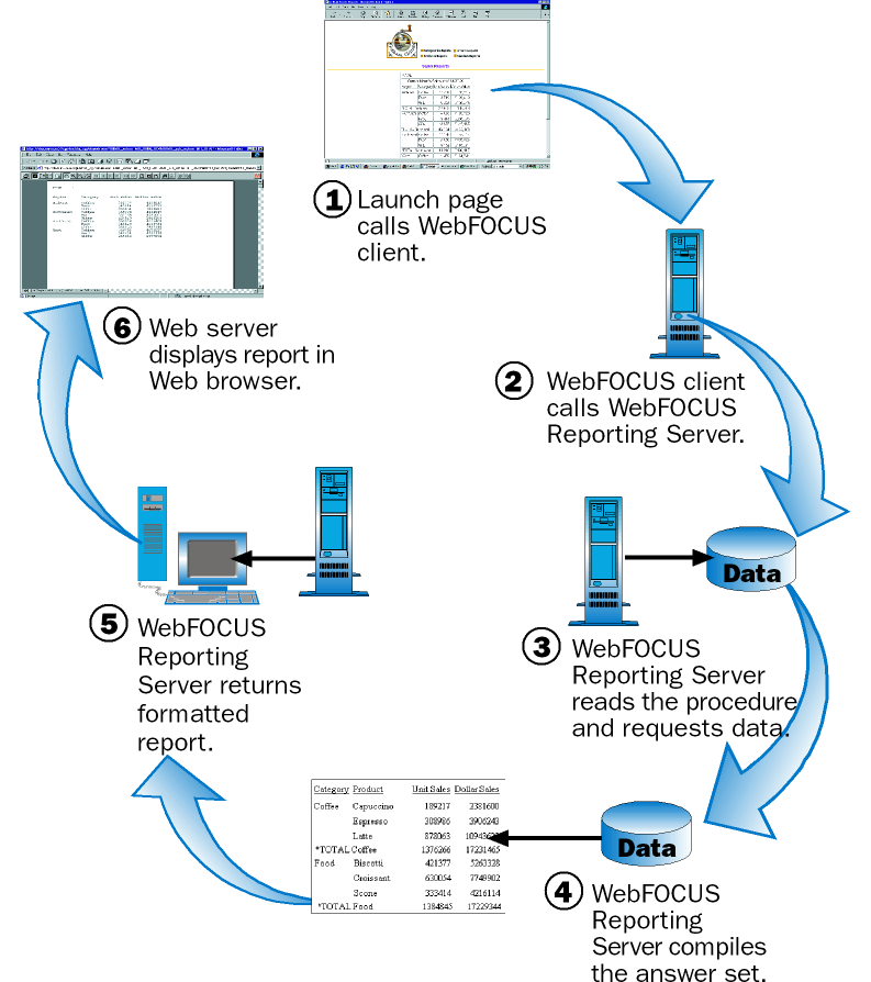 To develop and publish reporting applications to the web, you need software components that manage the flow. A WebFOCUS system comprises several components, including: