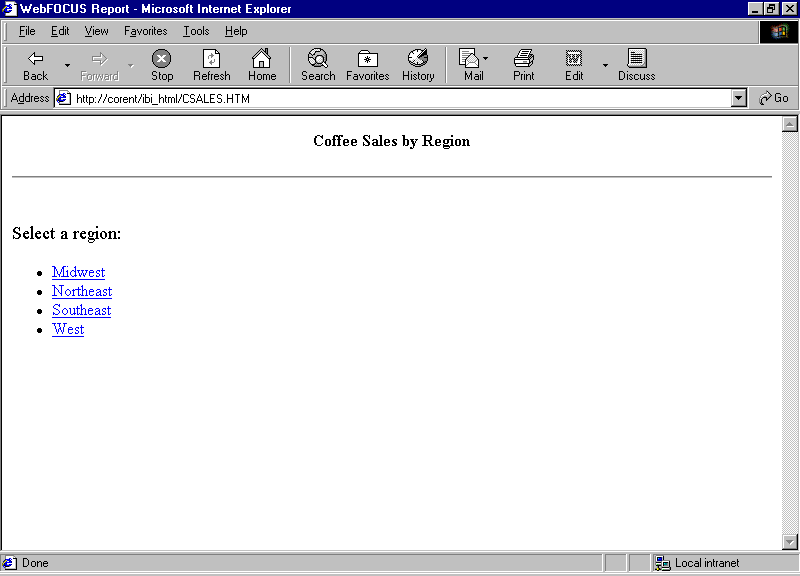 <HTML> <HEAD> <TITLE> WebFOCUS Report </TITLE> </HEAD> <BODY> <H4 ALIGN=CENTER>Coffee Sales by Region</H4> <HR> <P><FONT SIZE=+2></FONT><BR> <FONT SIZE=+1>Select a region:</FONT> </P> <UL TYPE=SQUARE> <LI>