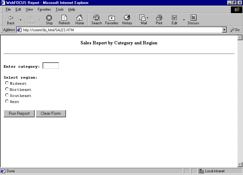 <FORM ACTION="/ibi_apps/WFServlet" METHOD="get"> <INPUT NAME="IBIF_ex" VALUE="csales" TYPE="hidden"> <P ALIGN=LEFT NOWRAP><PRE> <B>Enter category: </B><INPUT NAME="CATEGORY" TYPE="text" SIZE="6"> </PRE></P> <P><PRE><B>Select region: </B> <INPUT NAME="RGN" TYPE=RADIO VALUE=Midwest>Midwest <INPUT NAME="RGN" TYPE=RADIO VALUE=Northeast>Northeast <INPUT NAME="RGN" TYPE=RADIO VALUE=Southeast>Southeast <INPUT NAME="RGN" TYPE=RADIO VALUE=West>West </PRE></P> <P> <INPUT NAME="submit" TYPE=SUBMIT VALUE="Run Report"> <INPUT NAME="reset" TYPE=RESET VALUE="Clear Form"> </P> </FORM>