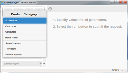A single select list will default to the first value in the list when no default value has been specified for the parameter, as shown in the following image.