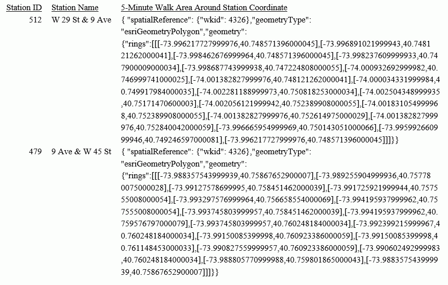 GIS_SERV_AREA_XY(START_STATION_LONGITUDE, START_STATION_LATITUDE, DISTANCE, TRAVEL_MODE, WKID);
