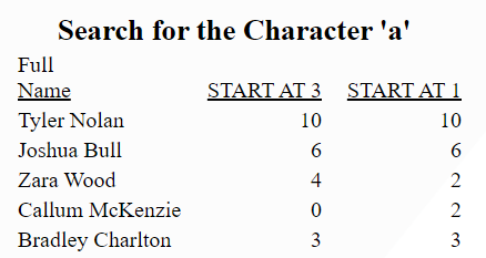 The following SQL SELECT statement searches for the character a in FULLNAME, starting at position 3, and starting at position 1.