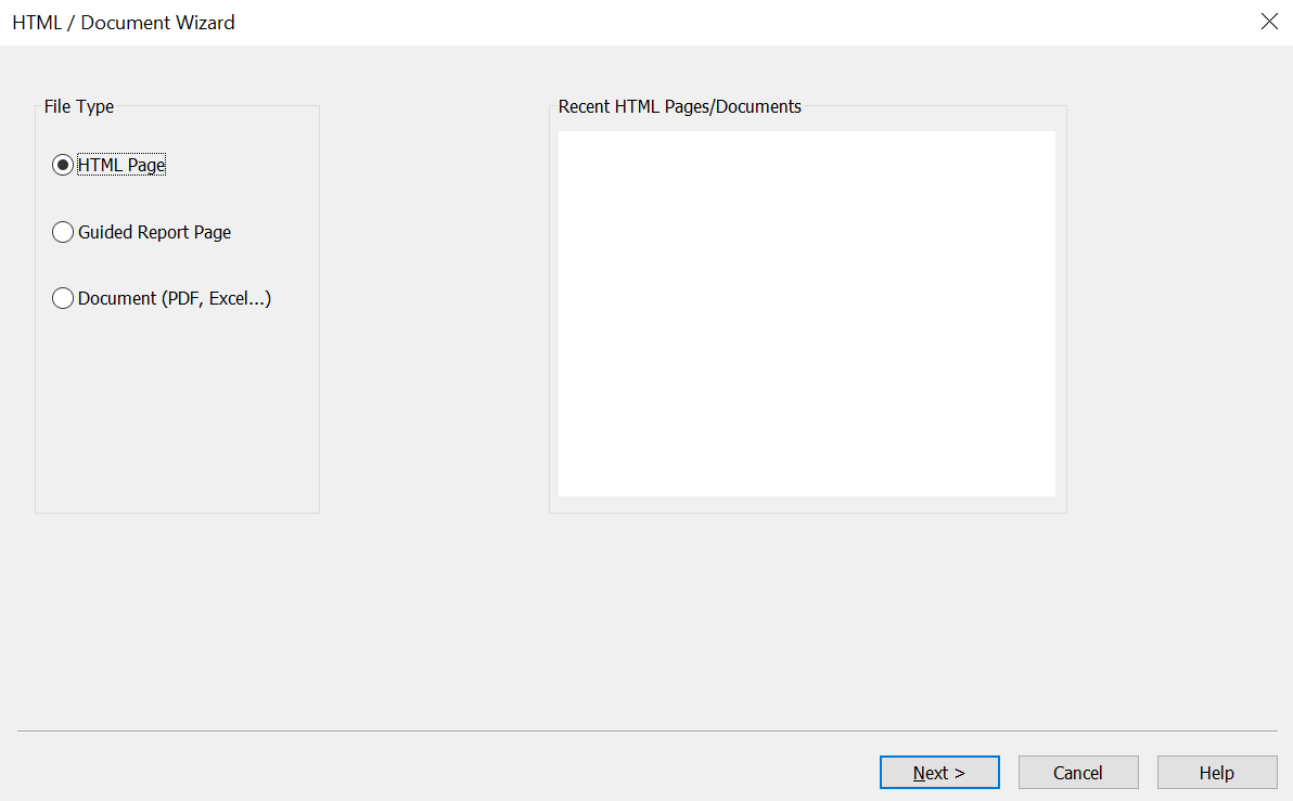 The HTML/Document Wizard allows you to create a new HTML Page, Guided Report Page, or Document, and open a recent procedure. This section details how to create an HTML page using the HTML/Document Wizard.
