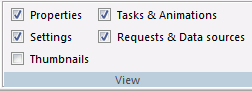 The View group allows you to display or hide the panels associated with an HTML Page or Guided Report page. This group is accessible in the Utilities tab of the HTML canvas and in the Text Editor tab when accessing the Embedded JavaScript and Embedded CSS view tabs. The View group is shown in the following image.
