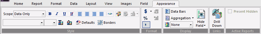 You use the Report tab to modify report properties, change the style of rows and columns on your report, or create filters. The Report tab contains the following groups: Filter, Report, Traffic Lights, Style, and Links. The Report tab is located at the top of the trademark and rebranding WebFOCUS App Studio interface and is available only when you are creating or working with a report. The Report tab is shown in the following image.