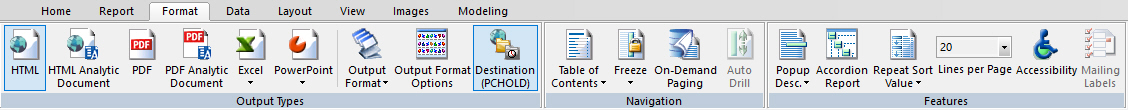 You use the Report Properties group to control report properties. The Report Properties group is shown in the following image.