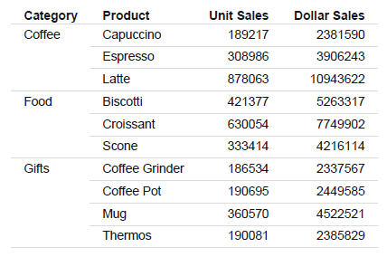 In the example below, we use the Category, Subcategory, and Model fields from the Product dimension of the WF_RETAIL database.