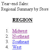 The following report procedure creates an HTML report output file for each different REGION value in the GGSALES data source. The report output files are named test0000.html, test0001.html, test0002.html, and so forth. The HTML index page is named test.html and contains a hyperlink for each REGION data value. The directory you select depends on where WebFOCUS is installed. In this example, the index page is stored in the directory e:\ibi\WebFOCUS82\temp.