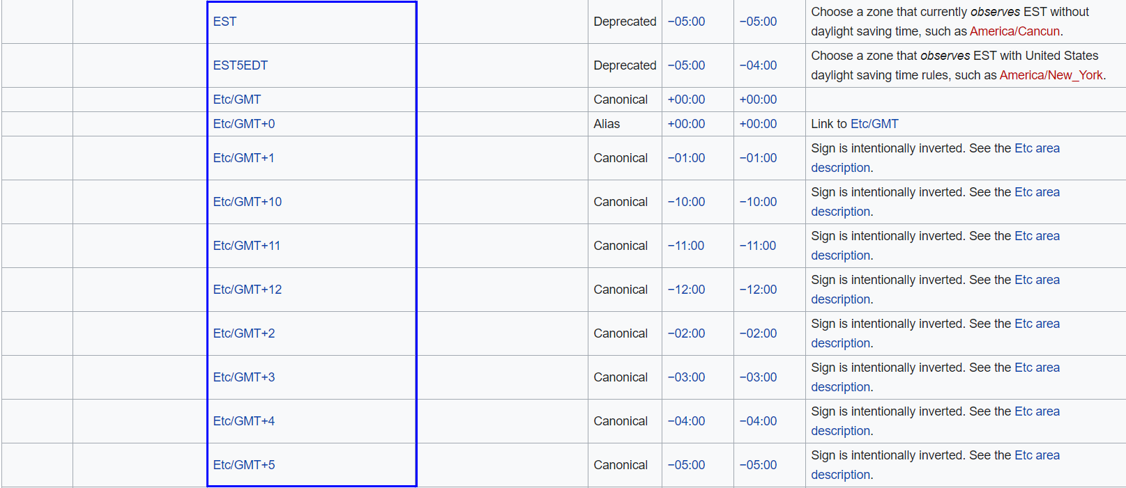 If you do not know what Area and Location corresponds to your time zone, but you do know your offset from GMT, or your legacy time zone name (such as EST), scroll down in the table. There are TZ database names that correspond to these time zone identifiers, as shown in the following image.