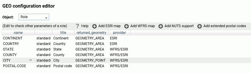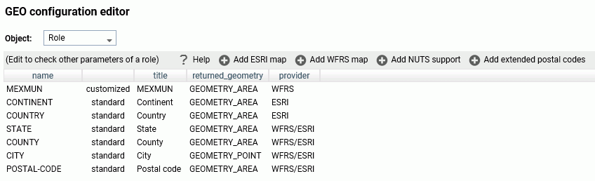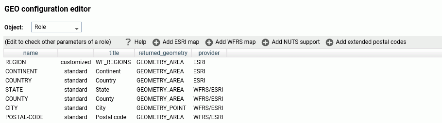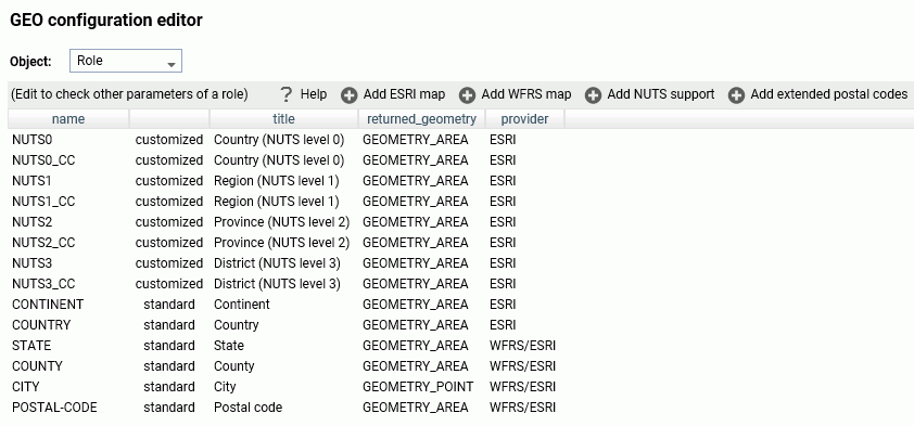 Go to the Workspace page. Click Settings, point to Geo Services, then click Edit Configuration. The GEO configuration editor opens displaying the configured geographic roles, as shown in the following image.