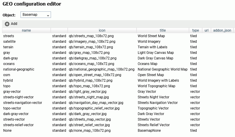 The following image shows the GEO configuration editor with the Basemap object selected, showing the list of standard basemaps.