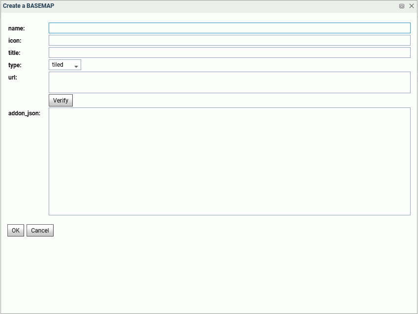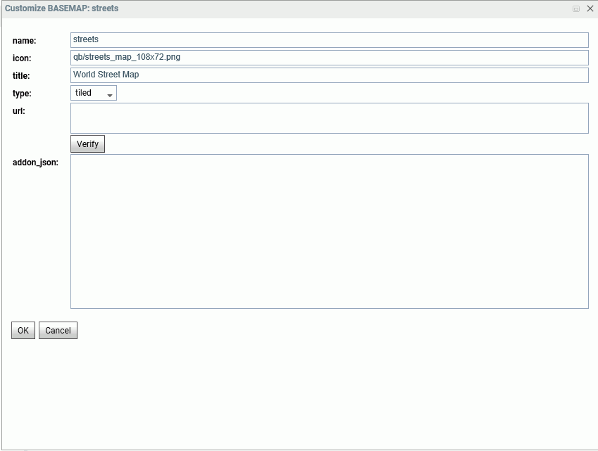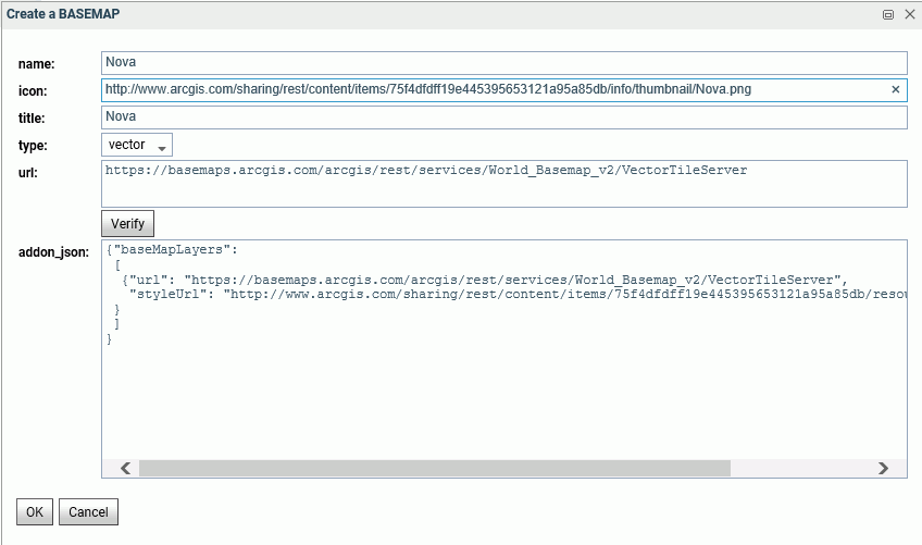 Enter a name for the basemap, a URL to the thumbnail, a title to display, and the URL to the map service that provides the basemap, and click Verify.